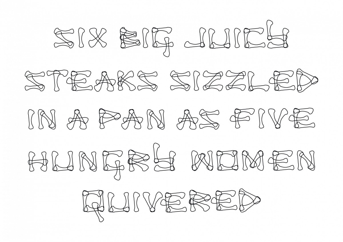 The media experience that inspired the design of this font is the photo-sharing application and social networking program, Instagram. Remains is a response to how I use the application, which is to take photos of food and share what I cook, what I eat, and where I eat, daily. The approach of my typography design was to shape letterforms from elements of food. I experimented using  different pasta shapes and thick liquids such as jams and sauces to create my letterforms. The design idea further developed from what I had been told by my mother as a child, to “never leave anything edible on my plate” and to “think of all the children starving in Africa.” By these words, I’ve been trained to eat everything edible on my plate as a child, only leaving behind what I cannot consume for example, bones and shells. This habit or way of eating is still in me today – I completely wipe my plate clean, and even had comments from various waiters across the cafés that I’ve been to say “well, I won’t be need to wash this plate!” Therefore the design of the letters is based on the shape of a bone from a chicken drumette. The alphabet is presented in uppercase to express importance and enforcement in a way that I have been ordered to eat a certain way. In addition, the thin lines that create the individual letters provide a sense of cleanliness, again reflecting on the idea of how I had to ‘clean’ my plate, making sure that I left nothing behind to please my mother. Also, the thin lines reflect the starving children in Africa, thin to their bones due to the lack of food.