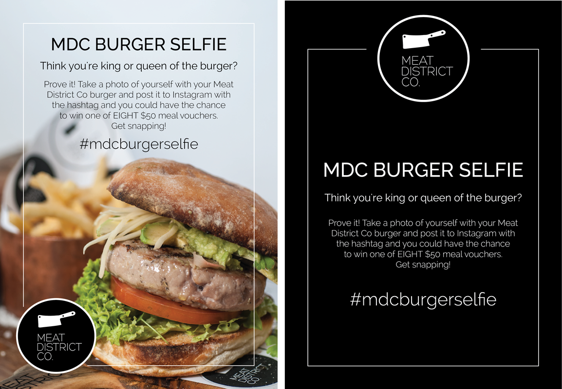 Meat District Co. – Sydney aims to re-awaken the senses & bring a new kind of dining to the streets of Sydney. Besides pushing their enticing menu over social media platforms such as Facebook and Instagram, Meat District Co. Sydney launched a competition to encourage their guests to eat, relax, and win some vouchers. Besides designing a graphic for both Facebook and Instagram to promote their competition, the other deliverable was to design a simple table menu stand for their restaurant.