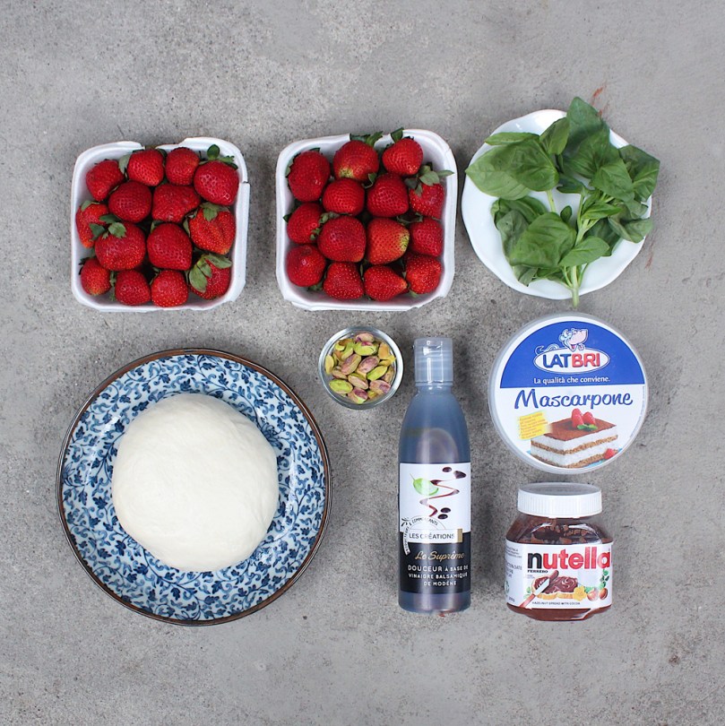 - Remove the pizza from the oven. Spread a thin (or if you are that type, a generous) layer of mascarpone cheese onto the dough and, top with the sliced strawberries and the nuts. Place it back into the oven with the grill setting on and grill for a further 3-4 minutes or until cooked all the way through. It should not take more than 10 minutes in total.