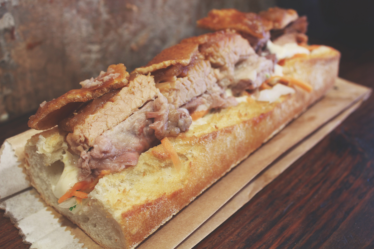 Crisp skinned slow roast 5 spiced pork belly served with Vietnamese salad in a roll ($13.00)